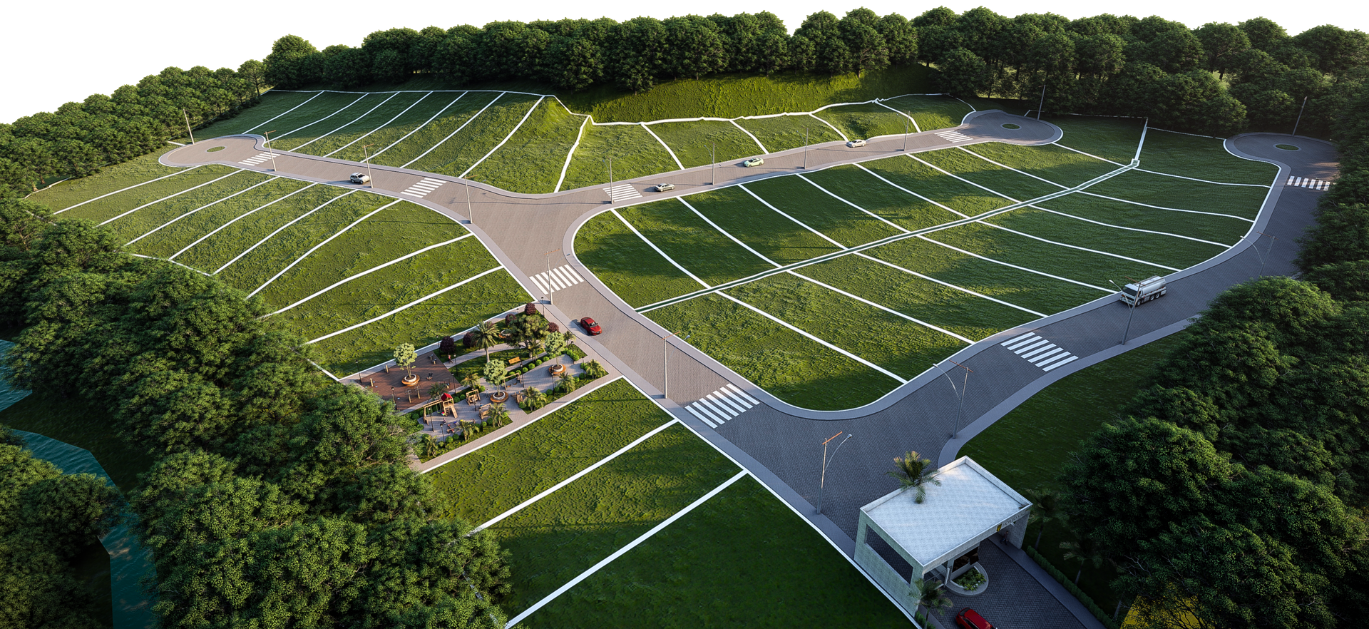 Nossa estrutura conta com agua fornecida por poço artesiano e o fornecimento de energia pela CEMIG, com uma área comum e playground no coração do condomínio.